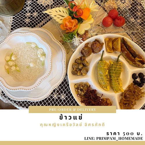 ข้าวแช่ตำรับ “คุณหญิงเครือวัลย์ อิศรภักดี” คุณครูใหญ่โรงเรียนการเรือนชื่อดังในอดีต ตำรับนี้มีพริกแห้งสอดไส้หมูสับทอด ทอดได้กรอบอร่อย รสกลมกล่อม หมูสับปลาเค็มห่อทอด ทอดมาในเปาะเปี๊ยะชิ้นเล็กๆ ที่เรียกกันว่า “ซองจดหมาย” พร้อมเครื่องเคียงอื่นๆ ครบชุด และผักแกะสลักสวยงาม และยังมีปลาแห้งแตงโม เนื้อปลาแห้งยีฝอยผัดแห้ง