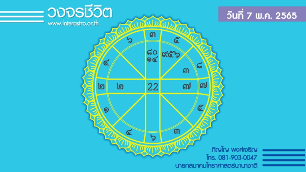 สุริยคติกาล วันที่ 7 พฤษภาคม พ.ศ. 2565 ค.ศ. 2022 จันทร คติกาล ตรงกับวันเสาร์ ขึ้น 7 ค่ำ เดือน 6 ปีขาล จัตวาศก จุลศักราช 1384 อาทิตย์อุทัย เวลา 05.54 น. เที่ยงจริง เวลา 12.15 น. อาทิตย์ตก เวลา 18.35 น.จันทร์ตก เวลา 23.23 น.