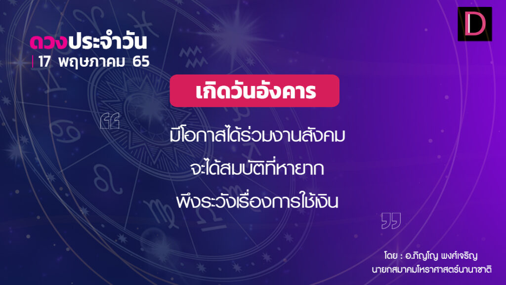 วันนี้ เวลา 00.00-11.54 น. ดาวจันทร์เสวยอนุราชนักษัตรฤกษ์ที่ 17 ประกอบด้วยราชาแห่งฤกษ์ ราชา แปลว่า พระเจ้าแผ่นดิน เวลา 11.55-24.00 น. ดาวจันทร์เสวยเชษฐนักษัตรฤกษ์ที่ 18 ประกอบด้วยสมโณแห่งฤกษ์ สมโณ แปลว่า ผู้สงบ วันอังคาร-อธิบดีและอุบาทว์ตามกาลโยค เวลา 00.00-07.19 น.-ห้ามทำการมงคลเวลา 07.20-11.54 น.-ทำการมงคลได้สารพัดตามฤกษ์บนหมวดราชาฤกษ์ เวลา 11.55-24.00 น.-ห้ามทำการมงคล ทิศที่เป็นมงคล-ตะวันตก ทิศอัปมงคล-ตะวันออก สีประจำวัน-ชมพู สีสิริมงคล-เหลือง น้ำตาล สีอัปมงคล-ขาว งาช้าง ราศีที่ดาวศรีสถิต-มีน ราศีที่ดาวกาลีสถิต-พิจิก