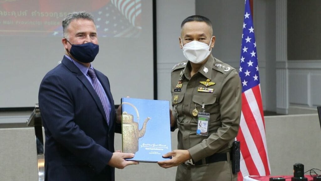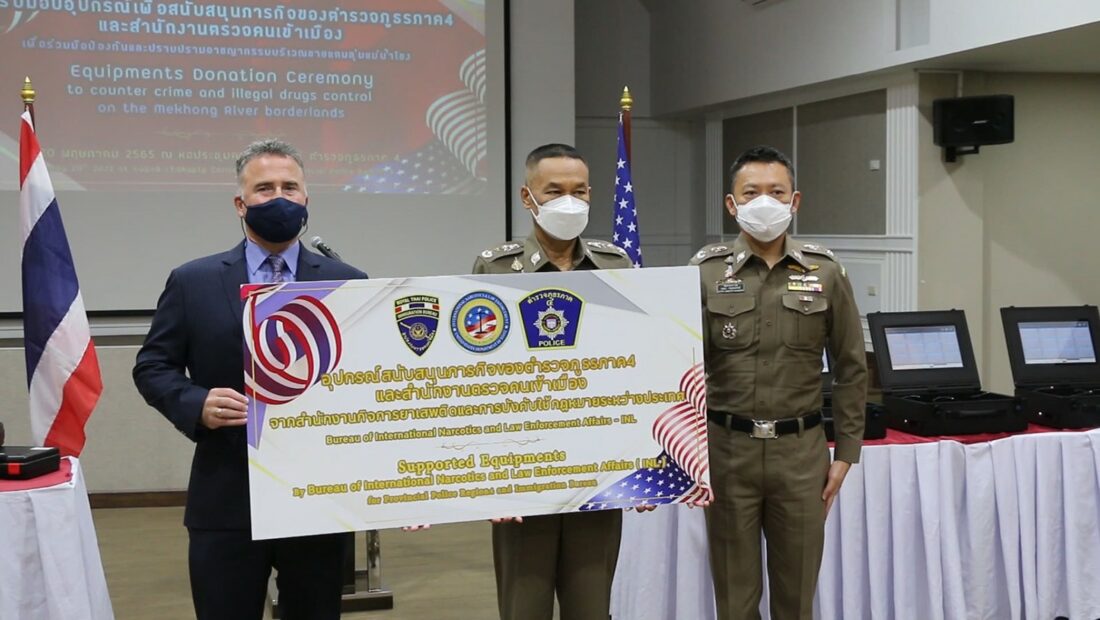 พล.ต.ท.ยรรยง เวชโอสถ ผบช.ภ.4 พร้อมด้วย พล.ต.ต.กฤษฎา กาญจนอลงกรณ์ รอง ผบช.สตม., พล.ต.ต.เดชา กัลยาวุฒิพงศ์ ผบก.ตม.4 และ พล.ต.ต.ณัฐนนท์ ประชุม ผบก.สส.ภ.4 ร่วมรับมอบอุปกรณ์เพื่อการตรวจหายาเสพติด และปราบปรามอาชญากรรมสนับสนุนภารกิจของตำรวจภูธรภาค 4 และกองบังคับการตำรวจตรวจคนเข้าเมือง 4 จาก นายเก็กกอรี่ ชอว์ ผู้อำนวยการฝ่ายความร่วมมือด้านการบังคับใช้กฎหมายและยาเสพติด (INL) สถานเอกอัครราชทูตสหรัฐอเมริกา ประจำประเทศไทย โดยมีข้าราชการตำรวจในสังกัด บช.ภ.4, บก.ตม.4 และคณะทำงานจากสถานทูตสหรัฐอเมริกา ประจำประเทศไทย ร่วมเป็นสักขีพยานมีมูลค่ารวม 12 ล้านบาท