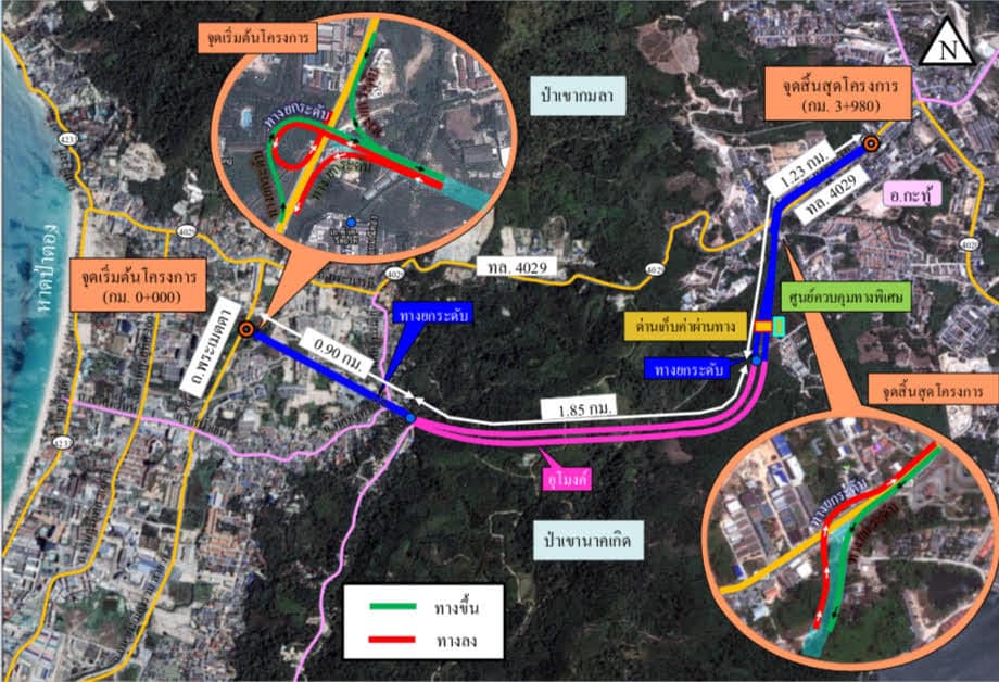 นายสุรเชษฐ์ กล่าวต่อว่า ทางด่วนสายนี้ มีจุดเริ่มต้นโครงการเชื่อมกับถนนพระเมตตา ในพื้นที่ ต.ป่าตอง อ.กะทู้ เป็นทางยกระดับขนาด 4 ช่องจราจรต่อทิศทาง ยกระดับข้ามถนนพิศิษฐ์กรณีย์ จนถึงเขานาคเกิด ระยะทาง 0.9 กม. แล้วจึงเป็นอุโมงค์ลอดเขานาคเกิด ระยะทาง 1.85 กม. หลังจากผ่านช่วงภูเขาจึงเป็นทางยกระดับ ระยะทาง 1.23 กม. จนสิ้นสุดโครงการในพื้นที่ อ.กะทู้ บริเวณจุดตัดกับ ทล.4029 มีด่านเก็บค่าผ่านทางอยู่บริเวณด้านกะทู้ 1 ด่าน เก็บค่าผ่านทาง 2 ทิศทาง มีทางขึ้น-ลง 2 จุด ได้แก่ บริเวณจุดเริ่มต้นโครงการ (ด้านป่าตอง) และบริเวณจุดสิ้นสุดโครงการ (ด้านกะทู้)