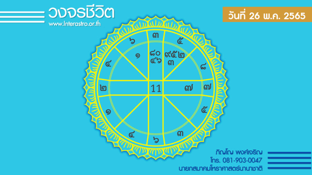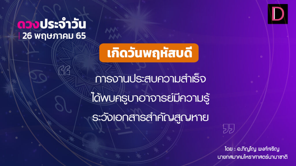 วันนี้ เวลา 00.00-01.30 น. ดาวจันทร์เสวยอุตรภัทรบทนักษัตรฤกษ์ที่ 26 ประกอบด้วยราชาแห่งฤกษ์ ราชา แปลว่า พระเจ้าแผ่นดิน เวลา 01.31-24.00 น. ดาวจันทร์เสวยเรวดีนักษัตรฤกษ์ที่ 27 ประกอบด้วยสมโณแห่งฤกษ์ สมโณ แปลว่า ผู้สงบ วันพฤหัสบดี-โลกาวินาศตามกาลโยค เวลา 00.00-24.00 น.-ห้ามทำการมงคล ทิศที่เป็นมงคล-ตะวันออกเฉียงเหนือ ทิศอัปมงคล-ตะวันตกเฉียงใต้ สีประจำวัน-เหลือง แสด สีสิริมงคล-แดงส้ม สีอัปมงคล-ดำ ม่วงแก่ เทา ราศีที่ดาวศรีสถิต-พฤษภ ราศีที่ดาวกาลีสถิต-มังกร
