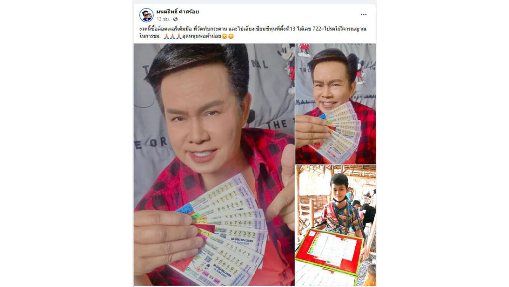 ส่วนเลขเด็ดคนดัง “มนต์สิทธิ์ คำสร้อย” นักร้องลูกทุ่งคนดัง บอกว่า งวดนี้ซื้อลอตเตอรี่เต็มมือ ไปเสี่ยงเซียมซีหุ่นพี่ผึ้งที่ 13 ได้เลข 722 ขณะที่เลขเด็ดที่เจ้าตัวได้บอกแฟนคลับ คือ 953-673-906–357–356