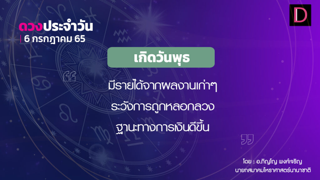 วันนี้ เวลา 00.00-06.42 น. ดาวจันทร์เสวยอุตรผลคุณีนักษัตรฤกษ์ที่ 12 ประกอบด้วยโจโรแห่งฤกษ์ โจโร แปลว่า โจร ผู้ปล้น ผู้ลักขโมย เวลา 06.43-24.00 น. ดาวจันทร์เสวยหัตถนักษัตรฤกษ์ที่ 13 ประกอบด้วยภูมิปาโลแห่งฤกษ์ ภูมิปาโล แปลว่า ผู้รักษาแผ่นดิน วันพุธเป็นวันธงชัย เวลา 00.00-24.00 น. ห้ามทำการมงคลตลอดทั้งวัน ทิศที่เป็นมงคล ทิศพายัพ ทิศอัปมงคล ทิศอาคเนย์ สีประจำวัน สีเขียว สีสิริมงคล สีม่วง สีอัปมงคล สีชมพู ราศีที่ดาวศรีสถิต ราศีเมษ ราศีดาวกาลีสถิต ราศีเมษ