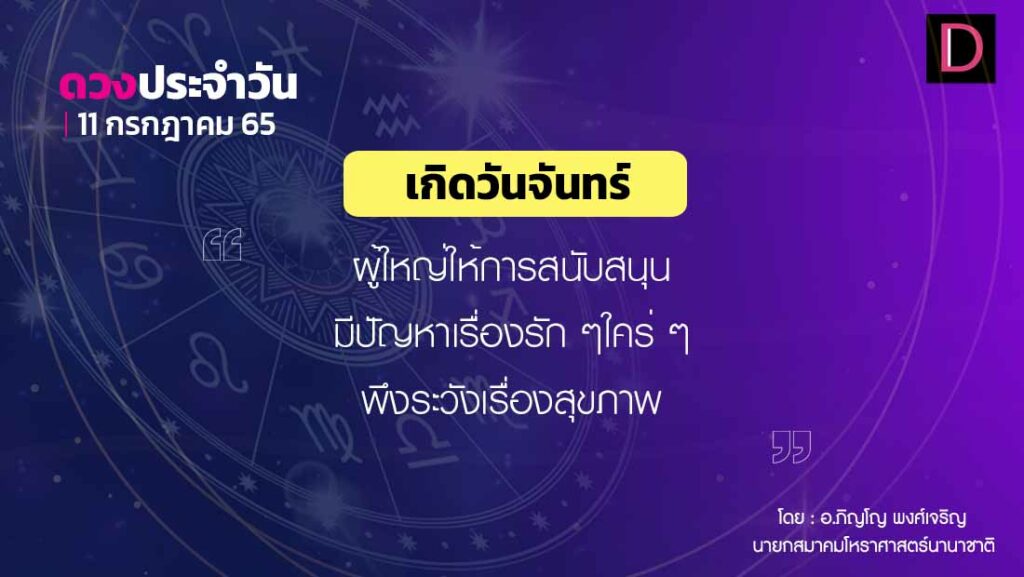 เกิดวันจันทร์ ผู้ใหญ่จะให้การสนับสนุนท่านเป็นอย่างดี จะมีเรื่องวุ่นวายเรื่องรัก ๆใคร่ ๆ การรับประทานอาหารที่แปลก ๆ และอากาศที่เป็นพิษและเปลี่ยนแปลงอย่างรวดเร็ว จะทำให้มีอาการเจ็บไข้ไม่สบาย จะได้รับของฝากของขวัญ มีงานใหม่ ๆ เข้ามาให้ทำ รายจ่ายหมดเปลืองไปกับการเดินทางท่องเที่ยวและการหาความสุข คนรักปรับความเข้าใจกันได้