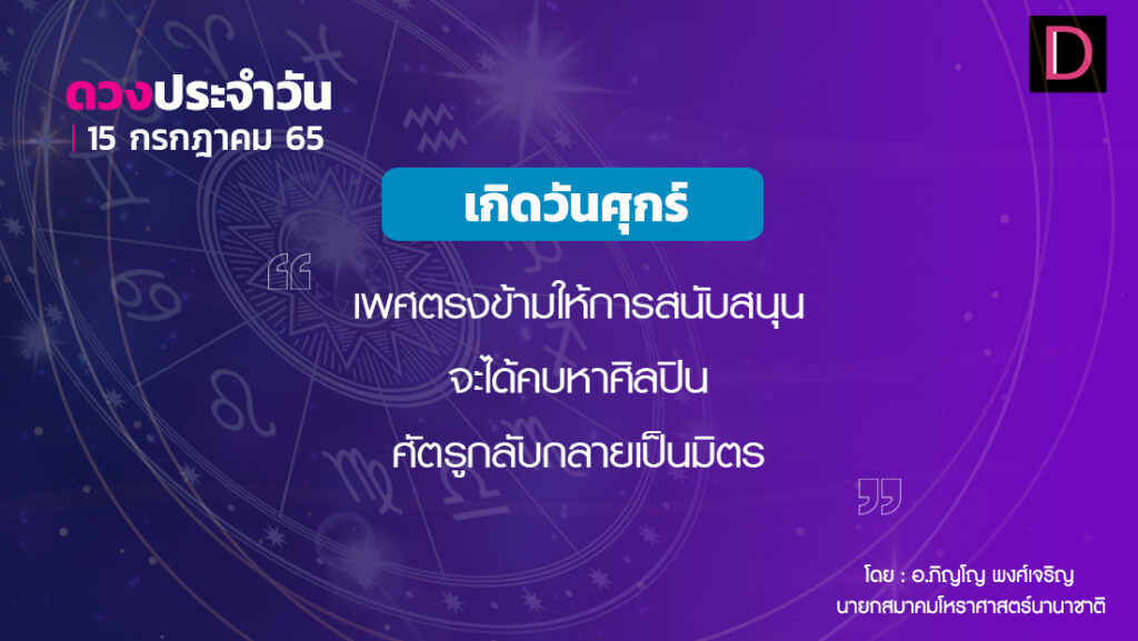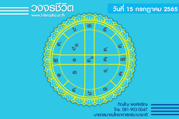 สุริยคติกาล วันที่ 15 กรกฎาคม พ.ศ. 2565 ค.ศ. 2022 จันทรคติกาล ตรงกับวันศุกร์ แรม 2 ค่ำ เดือน 8 ปีขาล จัตวาศก จุลศักราช 1384 อาทิตย์อุทัย เวลา 05.57 น. เที่ยงจริง เวลา 12.24 น. อาทิตย์ตก เวลา 18.50 น. จันทร์ขึ้น เวลา 19.52 น.