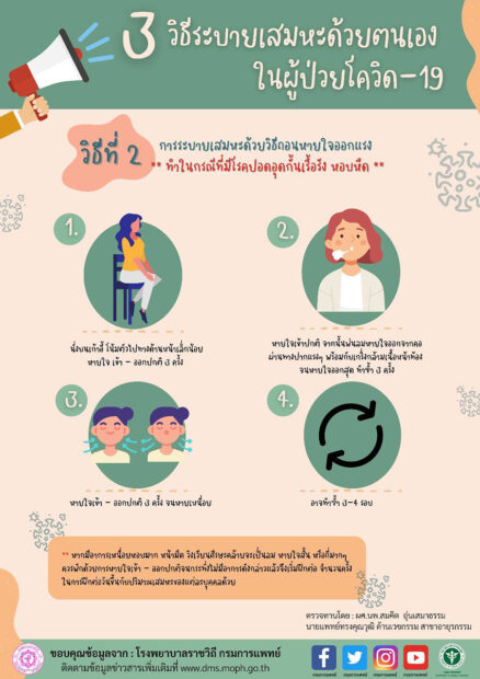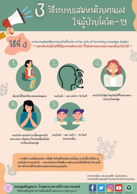 วิธีที่ 3 การระบายเสมหะด้วยการหายใจเป็นวงจร active cycle of breathing technique (ACBT) เหมาะสำหรับผู้ป่วยที่มีปัญหาทางเดินหายใจที่ไม่สามารถออกแรงมาก จนเหนื่อยเกินไปได้ สามารถทำได้โดย 1. นั่งบนเก้าอี้ในท่าที่สบายและผ่อนคลาย 2. หายใจเข้า-ออกปกติ 5-10 วินาที 3. หายใจเข้าให้สุด โดยเน้นให้ซี่โครงบานออกและหายใจออกสุด 4. หายใจเข้าออกปกติ จากนั้นถอนหายใจออกทางปาก (อ้าปากกดคางลงทำปากเป็นรูปวงกลม) พร้อมกับเกร็งกล้ามเนื้อหน้าท้อง กระทั่งหายใจออกสุด ทำซํ้า 3 ครั้ง และกลับมาหายใจเข้า-ออกปกติ 3 ครั้ง 5. หายใจเข้า-ออก ปกติ 5-10 วินาที จนหายเหนื่อย เป็นต้น