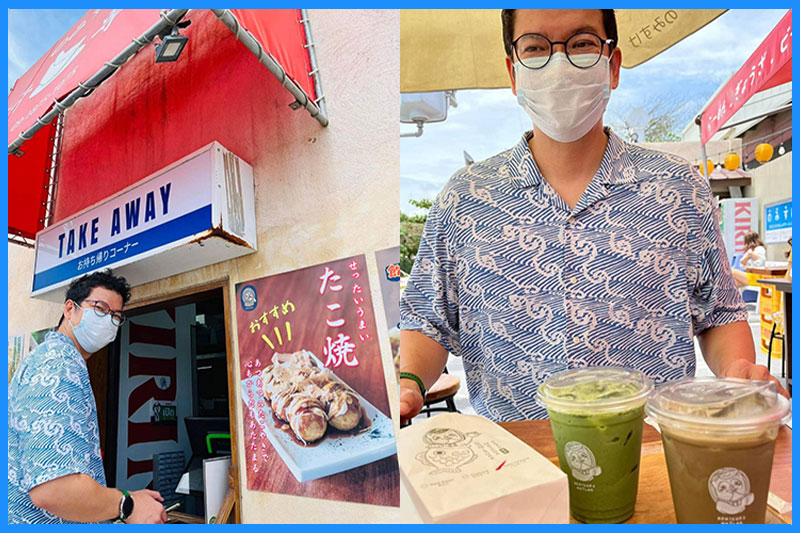 แต่ไม่ใช่อยู่ ๆ จะเดินเข้าไปถ่ายรูปได้เลยนะครับ ต้องเสียค่าผ่านประตูก่อน นั่นคือต้องไปสั่งอาหารและเครื่องดื่ม ได้แก่ ทาโกะยากิ เกี๊ยวซ่า ไทยากิ เครื่องดื่มสไตล์ญี่ปุ่นทั้งหลาย เช่น มัทฉะเย็น มัทฉะใส่นม ส้มยุซุโซดา บ๊วยโซดา วิธีสั่งต้องไปช่องที่เขียนว่า Take Away ก่อนครับ สั่งแล้วจ่ายเงินรับใบเสร็จ ไปจองที่นั่งก่อนก็ดี ไม่งั้นพอได้อาหารมาแล้วไม่รู้จะนั่งกินที่ไหน เครื่องดื่มจะได้ก่อน ส่วนอาหารต้องรอสักครู่ พนักงานจะประกาศเรียกให้ไปรับ เมื่ออาหารมาแล้ว ก็ไปถ่ายรูปได้ตามสบาย หรือจะฝากโต๊ะไว้กับโต๊ะข้าง ๆ ให้ช่วยดูให้หน่อย