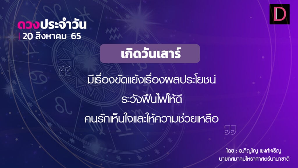 เกิดวันเสาร์ เงินทองถูกใช้ไปเกี่ยวกับการรักษาหน้าตาในสังคม การปรับปรุงซ่อมแซมต่อเติมอาคารที่อยู่อาศัย ระวังจะมีความขัดแย้งเรื่องรายได้ผลประโยชน์ ระวังฟืนไฟ ไฟฟ้า มีเหตุการณ์สำคัญเกิดขึ้นภายในครอบครัวเกี่ยวกับหลักทรัพย์ที่อยู่อาศัย ความรักควรเอาใจเขามาใส่ใจเรา คนรักเห็นใจและให้ความช่วยเหลือ.