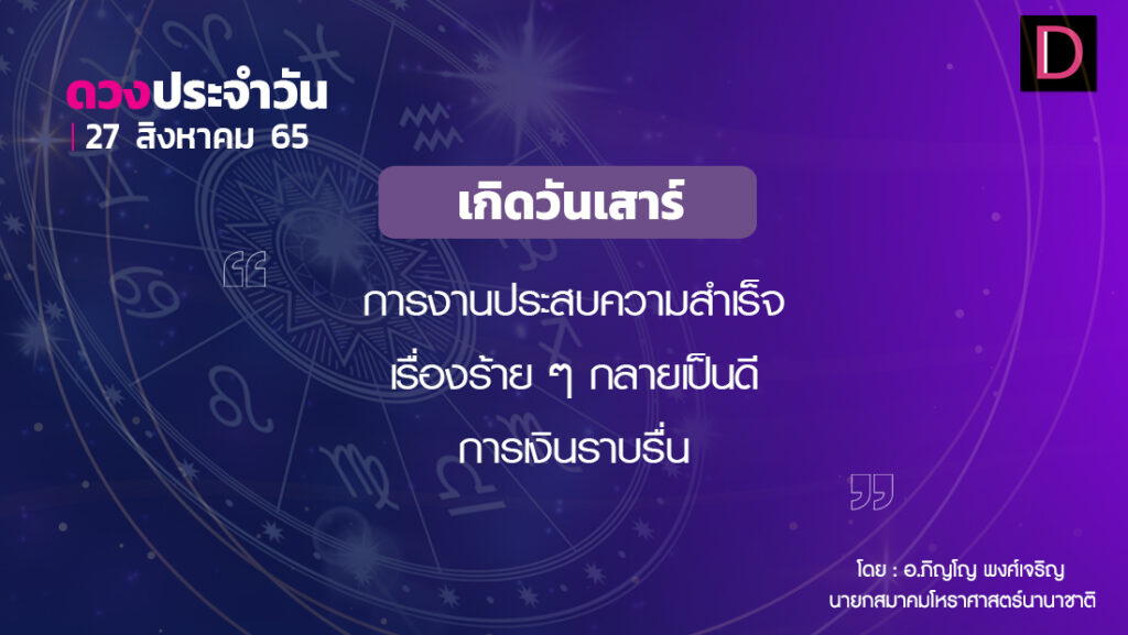 เกิดวันเสาร์ มีความเพียรพยายามในการแสวงหาทรัพย์สินเงินทอง ควรระวังการลงลายมือชื่อในเอกสารสัญญา เพราะอาจถูกหลอกลวงได้ง่าย มีโอกาสได้ใช้วิชาความรู้ที่ร่ำเรียนมา การงานจะประสบความสำเร็จ เรื่องร้าย ๆ กลายเป็นดี มีงานใหม่ ๆ เข้ามาให้ทำ การเงินหมุนเวียนดี จะได้ศึกษาวิชาแปลก ๆ ได้ของเก่า สิ่งเก่า ๆ ที่ทำไว้แต่ก่อนจะเกิดเป็นเรื่องขึ้นมา เพื่อนฝูงให้เกียรติยกย่องให้เป็นหัวหน้า.