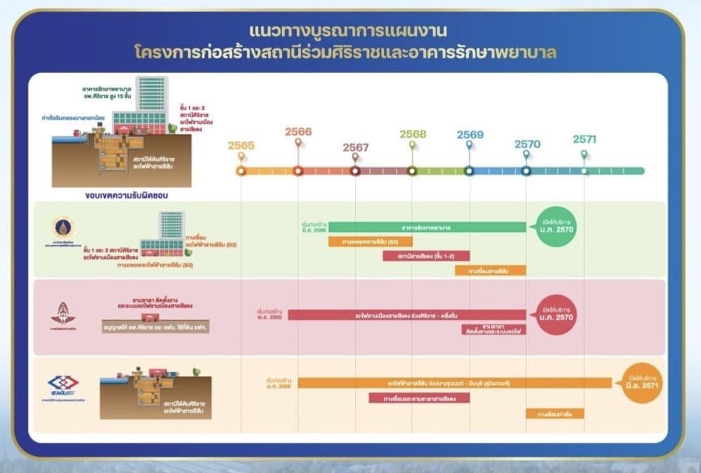 สำหรับอาคารรักษาพยาบาลของ รพ.ศิริราช คณะแพทยศาสตร์ศิริราชพยาบาล ออกแบบแล้ว กำลังนำเรื่องเข้าสู่การพิจารณาของคณะกรรมการอนุรักษ์และพัฒนากรุงรัตนโกสินทร์และเมืองเก่า เพื่อประกอบการขออนุญาตในขั้นตอนการก่อสร้างจากกรุงเทพมหานคร (กทม.) และอยู่ระหว่างนำเสนอ ครม.พิจารณาอนุมัติโครงการ คาดว่าจะเริ่มก่อสร้างกลางปี 66 พร้อมเปิดบริการปี 70