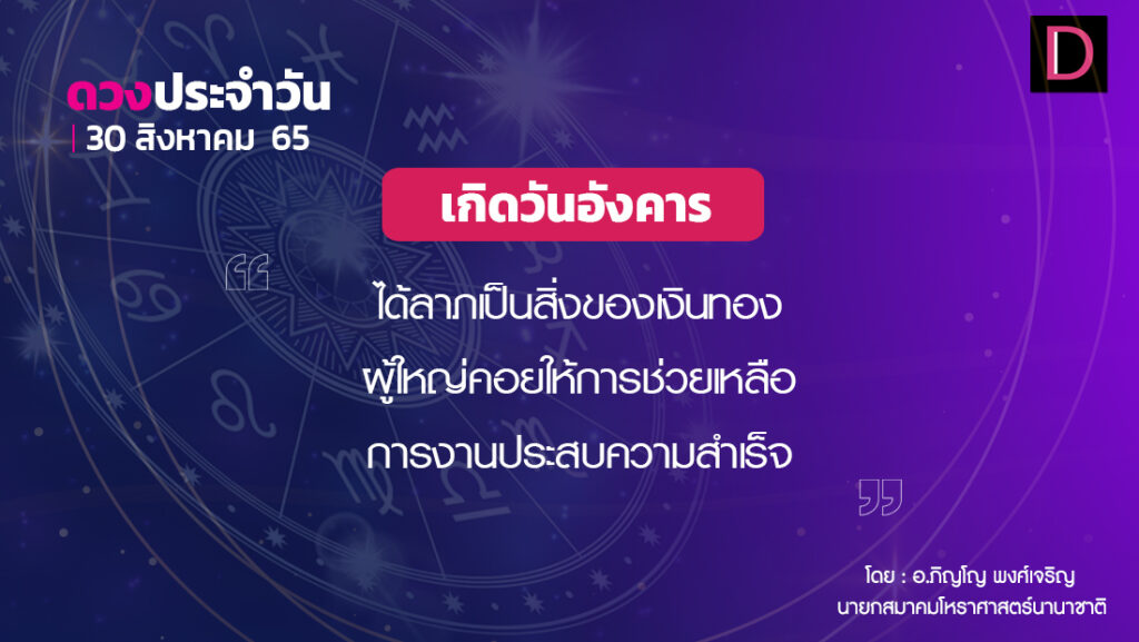 เกิดวันอังคาร จะได้ลาภเป็นสิ่งของเงินทอง โอกาสได้ทำงานสังคมมากขึ้น มีผู้ใหญ่คอยให้การช่วยเหลือ ปัญหาที่มีอยู่จะคลี่คลาย สิ่งของมีค่าที่ตกหล่นสูญหายจะได้คืน ควรรับฟังความคิดเห็นของคนรอบข้างบ้าง จะประสบความสำเร็จด้านการงาน มีลาภผลเล็กน้อย ระวังฟืนไฟและของร้อน การงานมีคู่แข่ง ระวังการใช้จ่าย ควรปรับความเข้าใจกับคนรอบข้างให้ดี