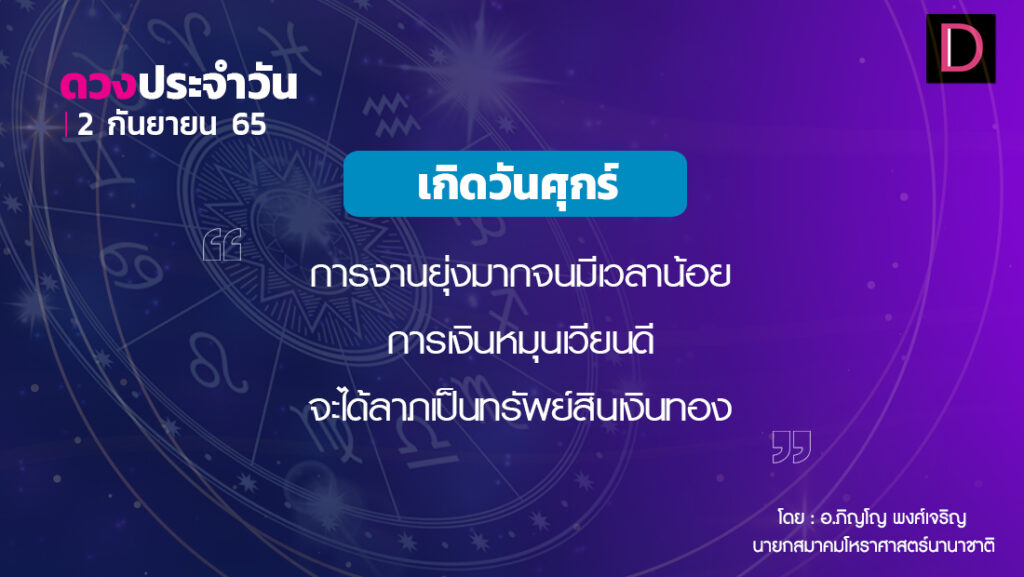 เกิดวันศุกร์ การเงินหมุนเวียนดี การงานยุ่งมากจนมีเวลาน้อย มีโอกาสได้ใช้ความรู้ความสามารถได้อย่างเต็มที่ มีการเดินทางไกลอย่างกะทันหัน จะได้ลาภเป็นของเก่าซึ่งมีผลทางจิตใจ มีเงินทองไหลเข้ามาหลายสาย จะมีโชคฟลุคทางการเงิน ได้ลาภเป็นทรัพย์สินเงินทอง มีรายได้เพิ่มขึ้นการงานคล่องตัว จะปรับปรุงตกแต่งที่อยู่อาศัยให้ดูดีมีความสะดวกสบายขึ้น
