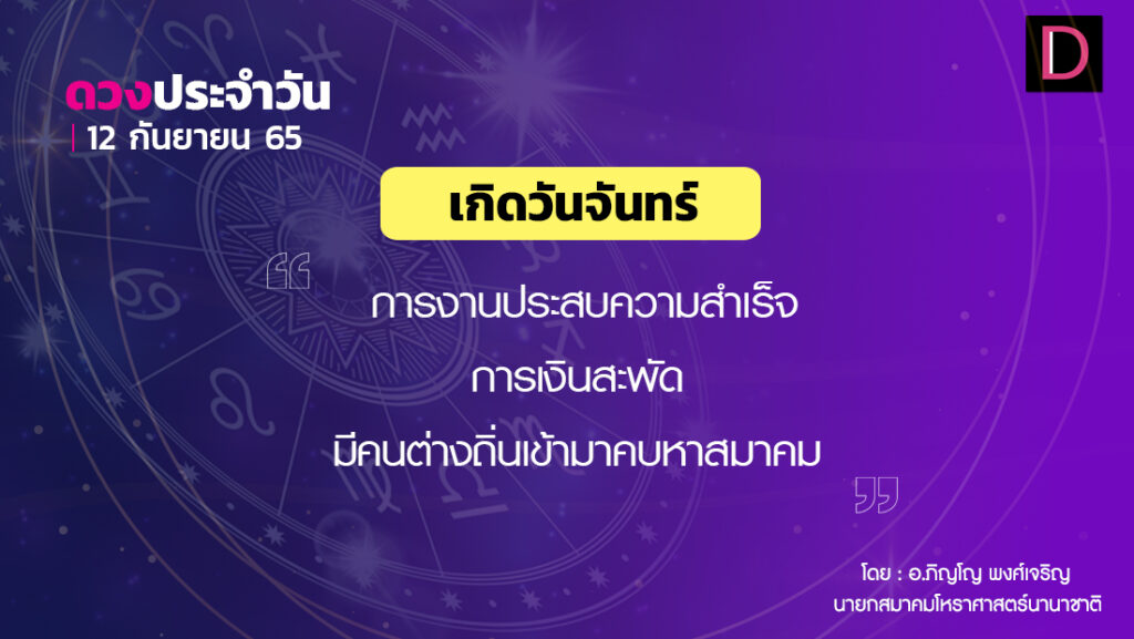 เกิดวันจันทร์ จะคิดมากเรื่องการเงิน มีเรื่องจำเป็นต้องใช้เงินควรรับฟังคำแนะนำของคนรอบข้างไว้บ้าง จะทำให้มีผลงานดีขึ้น การงานประสบความสำเร็จ การเงินสะพัดมีรายได้เข้ามาหลายทาง จะได้บริวาร คู่ครองคนรักสามารถปรับความเข้าใจกันได้ มีคนต่างถิ่นต่างแดนเข้ามาคบหาสมาคมด้วย มีความกระตือรือร้นในการทำงาน