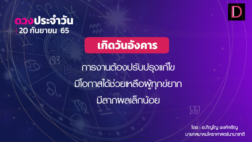 วันนี้ เวลา 00.00-19.30 น. ดาวจันทร์เสวยปุนนัพสุนักษัตรฤกษ์ที่ 7 ประกอบด้วยเพชฌฆาตแห่งฤกษ์ เพชฌฆาต แปลว่า ผู้ฆ่า เวลา 19.31-24.00 น ดาวจันทร์เสวยปุษยะนักษัตรฤกษ์ที่ 8 ประกอบด้วยราชาแห่งฤกษ์ ราชา แปลว่า พระเจ้าแผ่นดิน วันอังคาร-อธิบดีและอุบาทว์ตามกาลโยค เวลา 00.00-17.11 น.-ห้ามทำการมงคล เวลา 17.12-19.30 น.-ทำการมงคลได้ตามฤกษ์บนหมวดเพชฌฆาตฤกษ์ เวลา 18.32-24.00 น.-ทำการมงคลได้สารพัดตามฤกษ์บนหมวดราชาฤกษ์ ทิศที่เป็นมงคล-ตะวันตก ทิศอัปมงคล-ตะวันออก สีประจำวัน-ชมพู สีสิริมงคล-เหลือง น้ำตาล สีอัปมงคล-ขาว งาช้าง ราศีที่ดาวศรีสถิต-มีน ราศีที่ดาวกาลีสถิต-กรกฎ