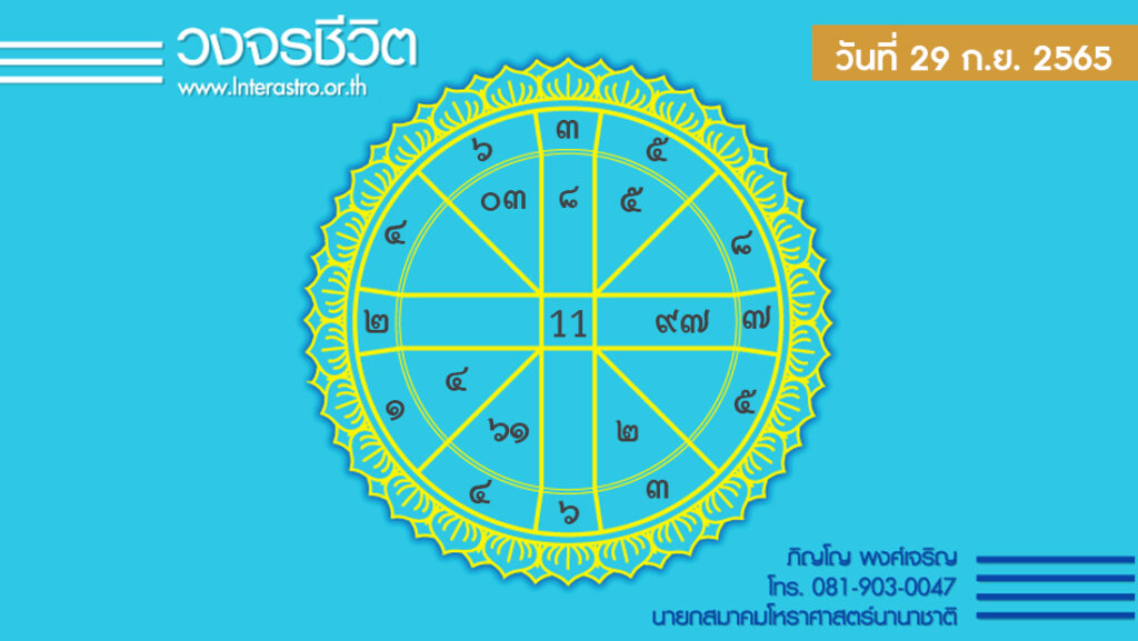 สุริยคติกาล วันที่ 29 กันยายน พ.ศ. 2565 ค.ศ. 2022 จันทรคติกาล ตรงกับวันพฤหัสบดี ขึ้น 4 ค่ำ เดือน 11 ปีขาล จัตวาศก จุลศักราช 1384 อาทิตย์อุทัย เวลา 06.07 น.เที่ยงจริง เวลา 12.09 น. อาทิตย์ตก เวลา 18.10 น. จันทร์ตก เวลา 21.20 น.