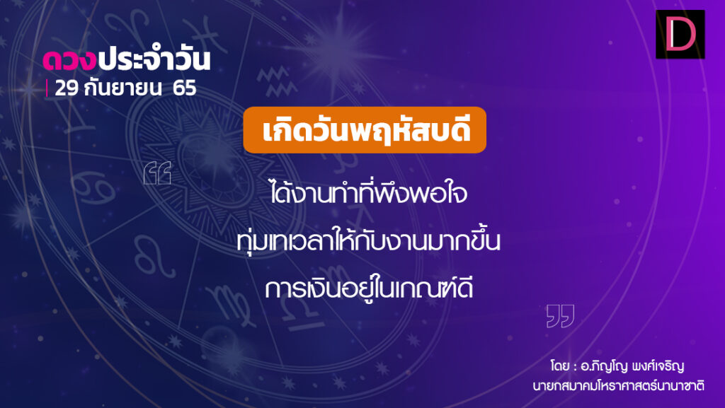 วันนี้ เวลา 00.00-05.54 น. ดาวจันทร์เสวยสวาตินักษัตรฤกษ์ที่ 15 ประกอบด้วยเทวีแห่งฤกษ์ เทวี แปลว่า นางพญา เวลา 05.55-24.00 น. ดาวจันทร์เสวยวิสาขานักษัตรฤกษ์ที่ 16 ประกอบด้วยเพชฌฆาตแห่งฤกษ์ เพชฌฆาต แปลว่า ผู้ฆ่า วันพฤหัสบดี-โลกาวินาศตามกาลโยค เวลา 00.00-05.54 น.-ทำการมงคลได้สารพัดตามฤกษ์บนหมวดเทวีฤกษ์ เวลา 05.55-22.55 น.-ทำการมงคลได้ตามฤกษ์บนหมวดเพชฌฆาตฤกษ์ เวลา 22.56-24.00 น.-ห้ามทำการมงคล ทิศที่เป็นมงคล-ตะวันออกเฉียงเหนือ ทิศอัปมงคล-ตะวันตกเฉียงใต้ สีประจำวัน-เหลือง แสด สีสิริมงคล-แดงส้ม สีอัปมงคล-ดำ ม่วงแก่ ราศีที่ดาวศรีสถิต-กันย์ ราศีที่ดาวกาลีสถิต-มังกร