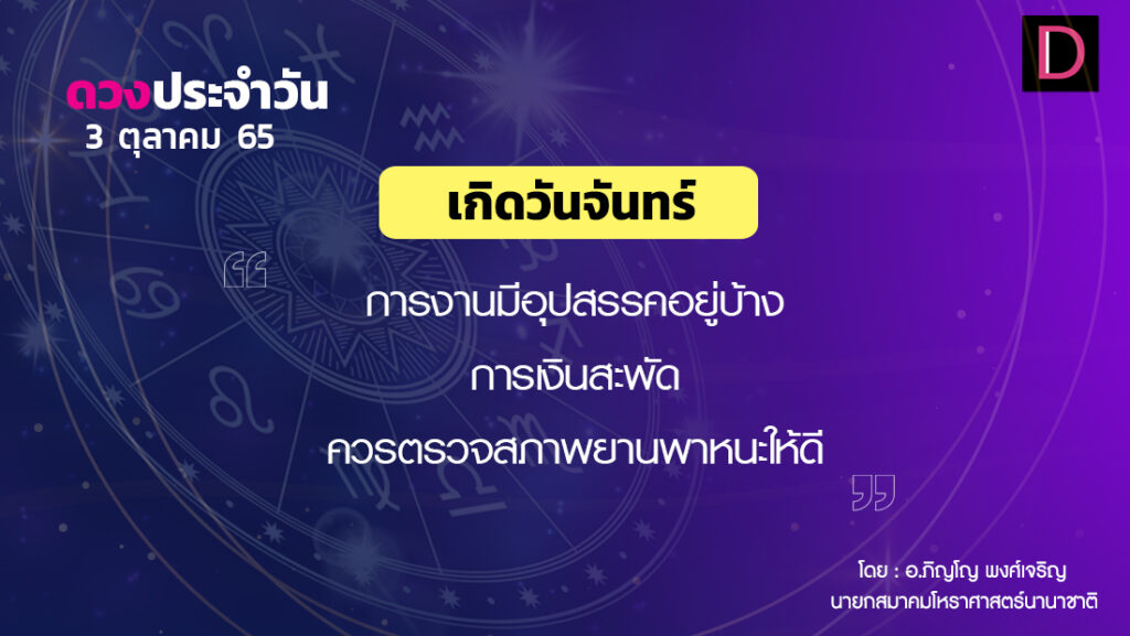 วันนี้ เวลา 00.00-00.42 น. ดาวจันทร์เสวยมูละนักษัตรฤกษ์ที่ 19 ประกอบด้วยทลิทโทแห่งฤกษ์ ทลิทโท แปลว่า ผู้ขอ ผู้มักน้อย ยากจนเข็ญใจ เวลา 00.43-24.00 น. ดาวจันทร์เสวยปุพพาษาฒนักษัตรฤกษ์ที่ 20 ประกอบด้วย มหัทธโนแห่งฤกษ์ มหัทธโน แปลว่า คหบดี เศรษฐี ผู้มั่งคั่งด้วยทรัพย์สินเงินทอง เวลา 00.00-24.00 น.-ห้ามทำการมงคล ทิศที่เป็นมงคล-ตะวันตกเฉียงใต้ ทิศอัปมงคล-ตะวันออกเฉียงเหนือ สีประจำวัน-ขาว สีสิริมงคล-ดำ ม่วงแก่ เทา สีอัป มงคล-แดง แดงส้ม ราศีที่ดาวศรีสถิต-มังกร ราศีที่ดาวกาลีสถิต-กันย์
