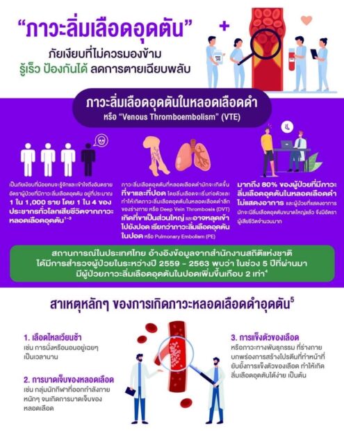 “ภาวะลิ่มเลือดอุดตันในหลอดเลือดดำ เป็นโรคที่พบผู้ป่วยเพิ่มมากขึ้น แต่มีคนรู้จักเพียง 20%” ซึ่งภาวะลิ่มเลือดอุดตันที่หลอดเลือดดำมักจะเกิดขึ้นที่ขาและที่ปอด โดยลิ่มเลือดจะเริ่มก่อตัวและทำให้เกิดภาวะลิ่มเลือดอุดตันในหลอดเลือดดำลึกของร่างกาย หรือ Deep Vein Thrombosis (DVT) เกิดที่ขาเป็นส่วนใหญ่ และอาจหลุดเข้าไปยังปอด เรียกว่าภาวะลิ่มเลือดอุดตันในปอด หรือ Pulmonary Embolism (PE) ทำให้มีอาการหายใจลำบาก เจ็บหน้าอก ไอเป็นเลือด ซึ่งบางรายอาจถึงขั้นเสียชีวิตเฉียบพลัน