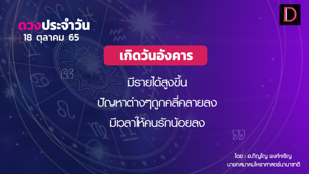 วันนี้ เวลา 00.00-04.18 น. ดาวจันทร์เสวยปุนนัพสุนักษัตรฤกษ์ที่ 7 ประกอบด้วยเพชฌฆาตแห่งฤกษ์ เพชฌฆาต แปลว่า ผู้ฆ่า เวลา 04.19-24.00 น. ดาวจันทร์เสวยปุษยะนักษัตรฤกษ์ที่ 8 ประกอบด้วยราชาแห่งฤกษ์ ราชา แปลว่า พระเจ้าแผ่นดิน วันอังคาร-อธิบดีและอุบาทว์ตามกาลโยค เวลา 00.00-06.38 น.-ห้ามทำการมงคล เวลา 06.39-24.00 น.-ทำการมงคลได้สารพัดตามฤกษ์บนหมวดราชาฤกษ์ ทิศที่เป็นมงคล-ตะวันตก ทิศอัปมงคล-ตะวันออก สีประจำวัน-ชมพู สีสิริมงคล-เหลือง น้ำตาล สีอัปมงคล-ขาว งาช้าง ราศีที่ดาวศรีสถิต-มีน ราศีที่ดาวกาลีสถิต-กรกฎ