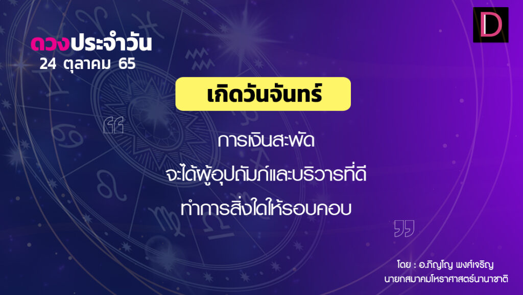 วันนี้ เวลา 00.00-13.54 น. ดาวจันทร์เสวยหัตถนักษัตรฤกษ์ที่ 13 ประกอบด้วยภูมิปาโลแห่งฤกษ์ ภูมิปาโล แปลว่า ผู้รักษาแผ่นดิน เวลา 13.55-24.00 น. ดาวจันทร์เสวยจิตรานักษัตรฤกษ์ที่14 ประกอบด้วยเทศาตรีแห่งฤกษ์หรือเวสิโยแห่งฤกษ์ เทศาตรี แปลว่า ข้ามถิ่น หมายถึงฤกษ์พ่อค้าข้ามถิ่น เวลา 00.00-24.00 น.-ห้ามทำการมงคล ทิศที่เป็นมงคล-ตะวันตกเฉียงใต้ ทิศอัปมงคล-ตะวันออกเฉียงเหนือ สีประจำวัน-ขาว สีสิริมงคล-ดำ ม่วงแก่ เทา สีอัปมงคล-แดง แดงส้ม ราศีที่ดาวศรีสถิต-มังกร ราศีที่ดาวกาลีสถิต-ตุล