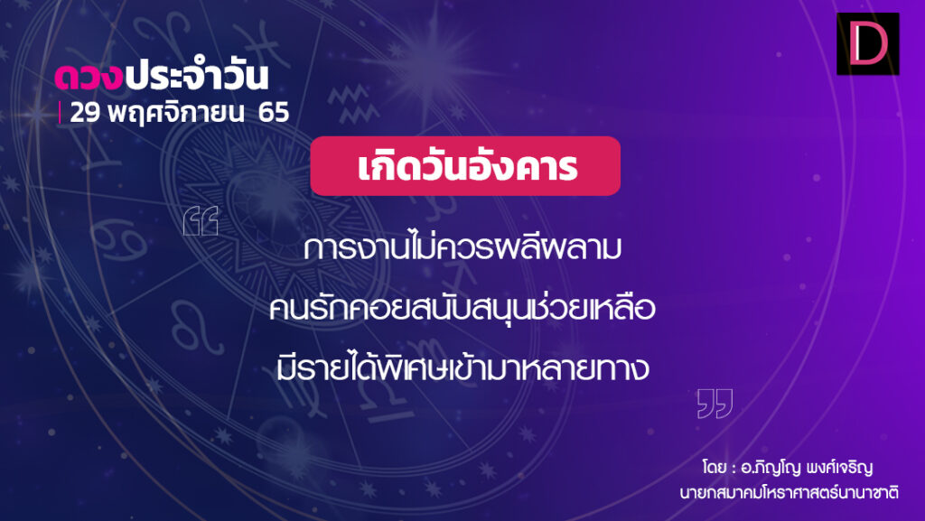 วันนี้ เวลา 00.00-13.06 น. ดาวจันทร์เสวยศรวณนักษัตรฤกษ์ที่ 22 ประกอบด้วยภูมิปาโลแห่ง ภูมิปาโล แปลว่า ผู้รักษาแผ่นดิน เวลา 13.07-24.00 น. ดาวจันทร์เสวยธนิษฐนักษัตรฤกษ์ที่ 23 ประกอบด้วยเทศาตรีแห่งฤกษ์หรือเวสิโยแห่งฤกษ์ เทศาตรี แปลว่า ข้ามถิ่น หมายถึงฤกษ์พ่อค้าข้ามถิ่น วันอังคาร-อธิบดีและอุบาทว์ตามกาลโยค เวลา 00.00-24.00 น.-ห้ามทำการมงคล ทิศที่เป็นมงคล-ตะวันตก ทิศอัปมงคล-ตะวันออก สีประจำวัน-ชมพู สีสิริมงคล-เหลือง น้ำตาล สีอัปมงคล-ขาว งาช้าง ราศีที่ดาวศรีสถิต-มีน ราศีที่ดาวกาลีสถิต-มังกร