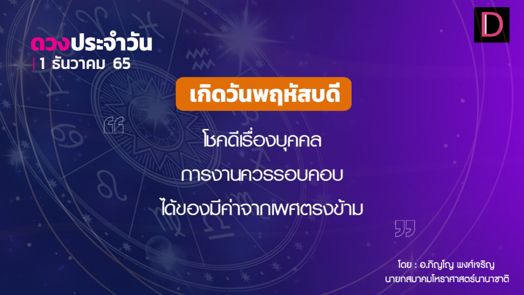 วันนี้ เวลา 00.00-09.54 น. ดาวจันทร์เสวยศตภิสัชนักษัตรฤกษ์ที่ 24 ประกอบด้วยเทวีแห่งฤกษ์ เทวี แปลว่า นางพญา หมายถึง สตรีผู้มีฐานะและตำแหน่งสูง เวลา 09.55-24.00 น. ดาวจันทร์เสวยปุรพภัทรบทนักษัตรฤกษ์ที่ 25 ประกอบด้วยเพชฌฆาตแห่งฤกษ์ เพชฌฆาต แปลว่า ผู้ฆ่า ทำการเพื่อให้สิ่งที่เข้ามาพ่ายแพ้ ข่มขวัญ น่ายำเกรง มีความขลังและมีความศักดิ์สิทธิ์ วันพฤหัสบดี-โลกาวินาศตามกาลโยค เวลา 00.00-24.00 น.-ห้ามทำการมงคล ทิศที่เป็นมงคล-ตะวันออกเฉียงเหนือ ทิศอัปมงคล-ตะวันตกเฉียงใต้ สีประจำวัน-เหลือง แสด สีสิริมงคล-แดงส้ม สีอัปมงคล-ดำ ม่วงแก่ เทา ราศีที่ดาวศรีสถิต-พิจิก ราศีที่ดาวกาลีสถิต-มังกร