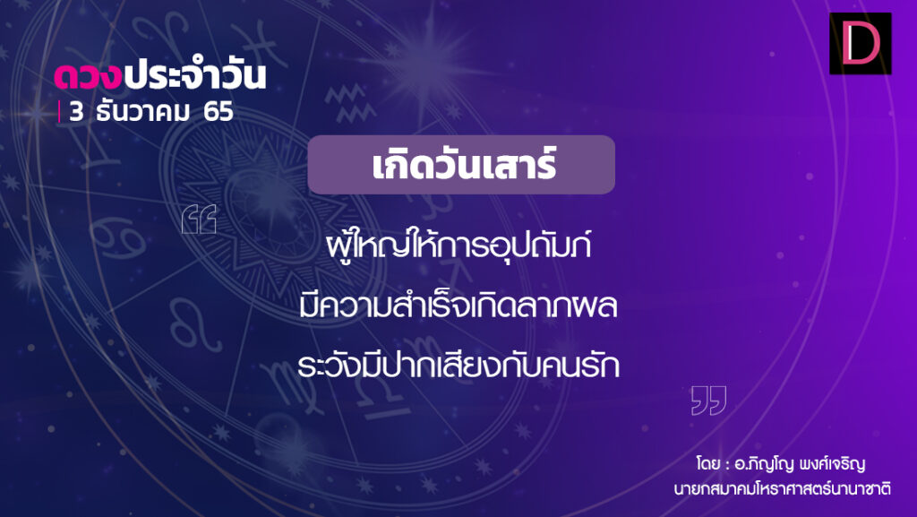 สุริยคติกาล วันที่ 3 ธันวาคม พ.ศ. 2565 ค.ศ. 2022 จันทรคติกาล ตรงกับวันเสาร์ ขึ้น 10 ค่ำ เดือน 1 ปีขาล จัตวาศก จุลศักราช 1384 อาทิตย์อุทัย เวลา 06.26 น. เที่ยงจริง เวลา 12.08 น.อาทิตย์ตก เวลา 17.49 น. จันทร์ตก เวลา 02.40 น.
