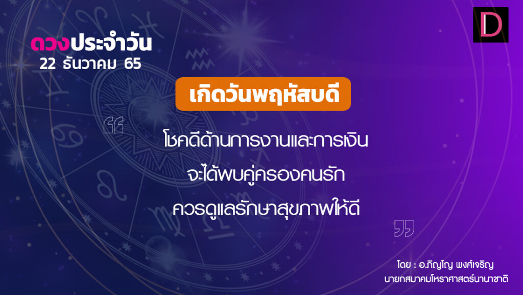 วันนี้ เวลา 00.00-03.54 น. ดาวจันทร์เสวยอนุราชนักษัตรฤกษ์ที่ 17 ประกอบด้วยราชาแห่งฤกษ์ ราชา แปลว่า พระเจ้าแผ่นดิน เวลา 03.55-24.00 น. ดาวจันทร์เสวยเชษฐนักษัตรฤกษ์ที่ 18 ประกอบด้วยสมโณแห่งฤกษ์ สมโณ แปลว่า ผู้สงบ วันพฤหัสบดี-โลกาวินาศตามกาลโยค เวลา 00.00-24.00 น.-ห้ามทำการมงคล ทิศที่เป็นมงคล-ตะวันออกเฉียงเหนือทิศอัปมงคล-ตะวันตกเฉียงใต้ สีประจำวัน-เหลือง แสด สีสิริมงคล-แดงส้ม สีอัปมงคล-ดำ ม่วงแก่ ราศีที่ดาวศรีสถิต-ธนู ราศีที่ดาวกาลีสถิต-มังกร