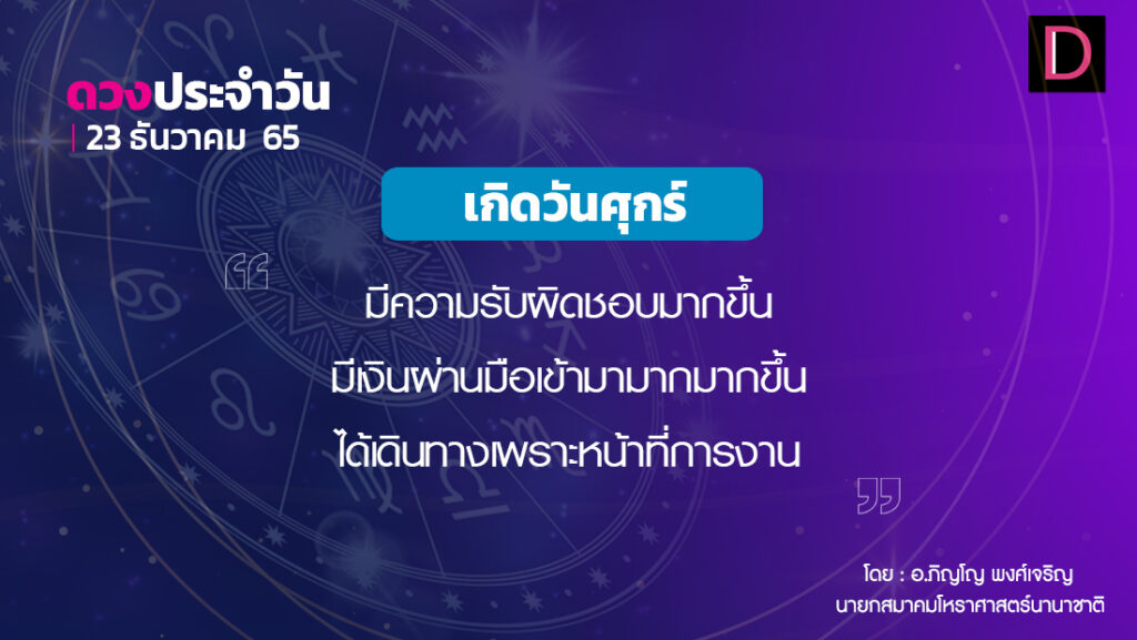 เกิดวันศุกร์ ศุกร์ศุกร์ต้องกัน จะมีลาภ บ้านเรือนที่อยู่อาศัยจะมีการปรับปรุงให้ดีขึ้น จะมีความรับผิดชอบมากขึ้น ด้วยเหตุที่เป็นคนมีสติปัญญา มีความรู้ความสามารถ จึงทำให้ประสบความสำเร็จในตำแหน่งหน้าที่การงานที่ทำอยู่ได้ไม่ยาก มีเงินผ่านมือเข้ามามาก แต่ก็มีรายจ่ายมาก จึงไม่ค่อยมีเงินเก็บ จะได้กรรมสิทธิ์ในอสังหาริมทรัพย์ มีเงินเหลือก็ควรเก็บออมไว้ใช้ในยามจำเป็นบ้าง