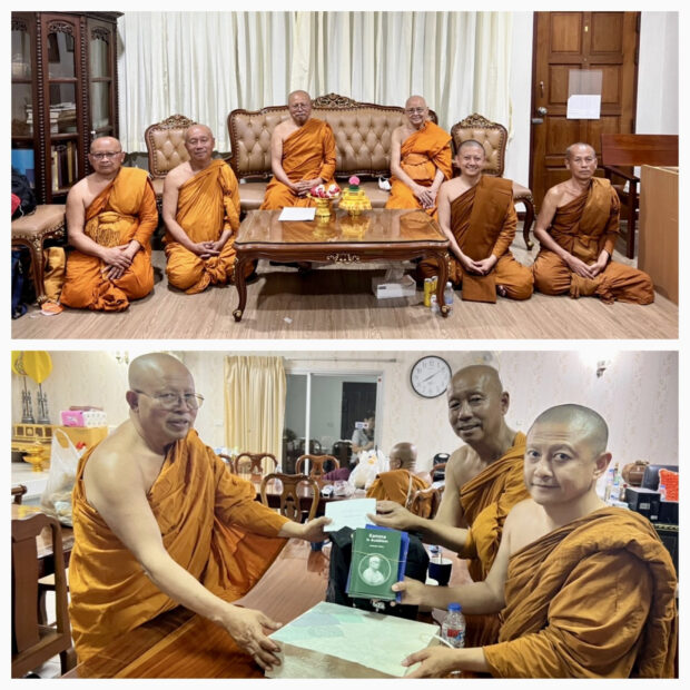 @@@ เมื่อวันจันทร์ที่ 12 ธันวาคม 2565 เวลา 17.55 น. พระสุธรรม ฐิตธัมโม พร้อมคณะพระธุดงค์รณรงค์เพื่อสันติภาพโลก เข้ากราบสักการะ และทำสามีจิกรรมพระเดชพระคุณ พระราชวัชรธรรมภาณี เจ้าอาวาสชลประทานรังสฤษฏ์ พร้อมด้วยพระวิเทศสิทธิธรรมมาภรณ์ (เจ้าคุณฤทธิ์) เจ้าอาวาสวัดอตัมมยตาราม นครซีแอ๊ตเติ้ล มลรัฐแคลิฟอร์เนีย สหรัฐอเมริกา ในโอกาสที่กลับมาปฎิบัติศาสนกิจที่ประเทศไทย ณ กุฏิเจ้าอาวาส บริเวณลานหินโค้ง พร้อมกันนี้พระสุธรรมและคณะ ได้ถวายรายงานเรื่องการเดินธุดงค์รณรงค์เพื่อสันติภาพ ตลอด 3 ปีที่ผ่านมา ในขณะเดียวกัน ก็ได้ถวายรายงานโอกาสที่จะเริ่มออกเดินต่อใน วันที่ 10 มกราคม ปี 2566 ที่จะมาถึงจากชายแดน ประเทศ อิหร่าน – ฝรั่งเศล ในการนี้พระเดชพระคุณเจ้าคุณฤทธิ์ ได้มอบหนังสือธรรมะเรื่อง “นิพพาน” ของพระธรรมโฆษาจารย์ (หลวงพ่อพุทธทาส) เพื่อนำไปมอบให้ชาวต่างชาติ ตามเส้นทางเดินให้กับ ผู้ที่สนใจศึกษาพระธรรมในแนวทางพุทธศาสนา ดังพุทธพจน์ที่ว่า “จรถ ภิกฺขเว จาริกํ พหุชนหิตาย พหุชนสุขาย โลกานุกมฺปาย” ภิกษุทั้งหลาย เธอทั้งหลายจงจาริกไป เพื่อประโยชน์สุขแก่ชนจำนวนมาก เพื่อเกื้อการุณย์แก่ชาวโลกนั้นสืบต่อไป