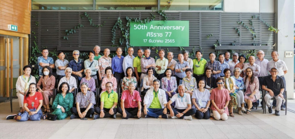 @@@ ในโอกาสที่เดินทางกลับเมืองไทย เมื่อวันเสาร์ที่ 17 ธันวาคม 2565 นายแพทย์ภุชงค์ คุณสุรีย์ ศรีเศรษฐนิล ได้ร่วมงานพบปะสังสรรค์ 50 ปี เพื่อนศิริราชรุ่น 77 ณ โรงแรมศิวาเทล โดยนายแพทย์ภิญโญ เปลี่ยนรังษี ประธานรุ่น นายแพทย์อภิชาติ ศิวยาธร และเพื่อนหมออีกหลายท่านที่เป็นศูนย์รวมให้เกิดกิจกรรมดี ๆ ของรุ่น 77 ความรู้ความสามารถที่คุณหมอทุกท่านได้มาจากคณะแพทย์ศาสตร์ศิริราชนั้น สามารถสร้างคุณประโยชน์ให้ส่วนรวมได้มาตลอดชีวิต ถึงเวลาที่ต้องตอบแทนบุญคุณ ด้วยการที่คุณหมอและครอบครัวร่วมกันบริจาคให้คณะแพทย์ศาสตร์ศิริราช ในเดือนมกราคม 2566 ที่จะถึงนี้เป็นจำนวนเกือบ 10 ล้านบาท