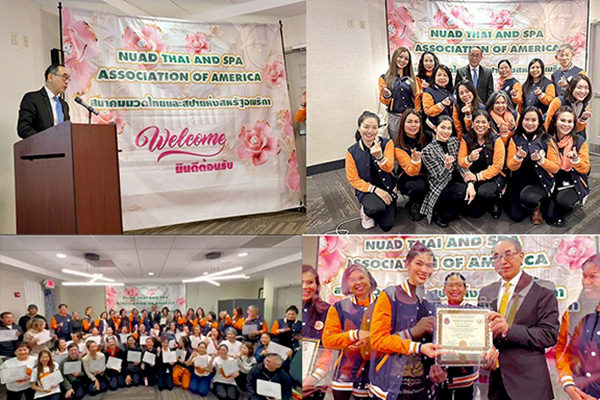 @@@ ระหว่างวันที่ 13-14 ธันวาคม 2565 สมาคมนวดไทยและสปาแห่งสหรัฐอเมริกา จัดอบรมนวดไทยสัญจร ส่งท้ายปีเก่า คอร์สกล้ามเนื้อเชิงลึกแบบผสมผสาน ( Integrative Deep Tissue Massage Class) วิทยากรโดย คุณวรรษขนิษฐ์ หลักคำ (ครูแป้ง) ณ Hilton Garden Inn Silver Spring North นำทีมโดยคุณแสงทอง แสงแก้ว นายกสมาคมนวดไทยฯ ที่ปรึกษากิตติมศักดิ์ และ คณะกรรมการทีมงานบริหารสมาคมนวดไทยฯ ในการอบรมครั้งนี้ได้รับเกียรติจาก ออท.ธานี แสงรัตน์ เอกอัครราชทูต ณ กรุงวอชิงตัน,ดี.ซี. เป็นประธานพิธีเปิดงาน และมอบประกาศนียบัตรให้กับผู้จบคอร์สการอบรม มีผู้สนใจเข้าร่วมอบรมมาจากต่างรัฐหลายท่าน อาทิ จากรัฐเวอร์จิเนีย รัฐแมริแลนด์,กรุงวอชิงตัน,ดี.ซี. และมลรัฐอื่น ๆ และจากสวิตเซอร์แลนด์ ด้วย โดยมีผู้ร่วมอบรมทั้งหมดจำนวน 34 คน จุดประสงค์ในการอบรมครั้งนี้เพื่อให้สมาชิกฯและผู้ที่สนใจได้เรียนรู้ฝึกฝน เสริมทักษะในการประกอบอาชีพนวดไทย ทีมงานบริหารสมาคมนวดไทยฯ ฝากขอบคุณ ออท.ธานี แสงรัตน์,คุณวรรษขณิษฐ์ (ครูแป้ง) แชมป์นวดอันดับหนึ่งของสหรัฐฯ ปี2022 และแชมป์นวดโลกสากลปี2022 ที่มาถ่ายทอดวิชานวดไทยให้กับผู้สนใจนวดไทยเพื่อนำไปพัฒนาต่อยอดกับอาชีพนวดไทย, คุณแสงทอง แสงแก้ว นายกสมาคมนวดไทยฯ ที่ทุ่มเทแรงกาย แรงใจ ทำงานหนัก จัดโครงการดี ๆ ให้กับผู้ประกอบการอาชีพนวดไทย เดินทางไปล่วงหน้าเพื่อจัดเตรียมสถานที่และความพร้อมก่อนงานอบรม, อ.ช้างบินตรงมาจากเยอรมัน มาสนับสนุน ช่วยดูแลการเรียนการสอนตลอดทั้ง 2 วันจนจบงาน และสุดท้ายทีมงานฯ น้อง ๆ ทุก ๆคน เจ้าของพื้นที่ที่มาช่วยรับลงทะเบียนและช่วยงานทุก ๆด้าน จนงานสำเร็จลุล่วงไปด้วยดี Job well Done !