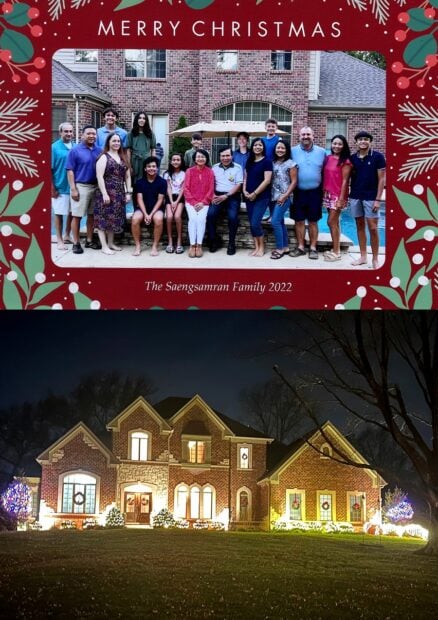 @@@ เทศกาลคริสต์มาสกำลังย่างกรายมาถึง นพ.สนั่น และ คุณเพลินจิตต์ แสงสำราญ ตกแต่งบ้านประดับประดาด้วยหลอดไฟหลากสีไฟกระพริบสวยงามทั้งในบ้านและนอกบ้าน พร้อมกันนั้นก็เรียกลูก ๆ หลาน ๆ มาถ่ายภาพด้วยกันทำเป็นโปสเตอร์ส่งถึงเพื่อน ๆ สมัยก่อนก็ต้องส่งทางไปรษณีย์ สมัยนี้สะดวกสบายส่งทางอากาศถึงผู้รับไม่ถึงนาที ไม่ต้องเสียค่าแสตมป์ไปรษณีย์ สะดวกสบายดี