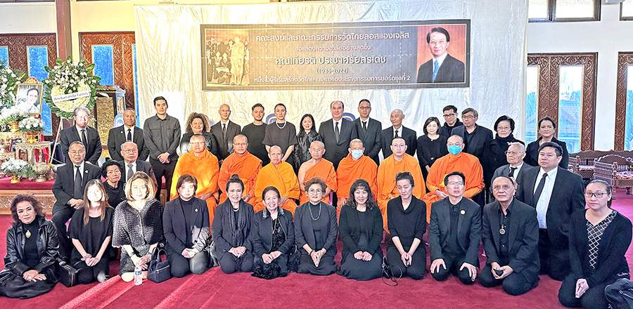 @@@ เมื่อวันอังคารที่ 20 ธันวาคม 2022 พระเทพมงคลวิเทศ เจ้าอาวาสวัดไทย แอล.เอ. กรุณาให้คณะสงฆ์และกรรมการวัดไทยลอส แองเจลีส จัดพิธีสวดพระอภิธรรม(รูปภาพ) คุณเกียรติ ประชาศรัยสรเดช หนึ่งในผู้ก่อตั้งและอดีตประธานกรรมการบอร์ดวัดไทยลอสแองเจลิส รุ่นที่ 2 มีเพื่อนๆพี่น้องลูกหลานมาร่วมพิธีกว่า 40 คน คุณเกียรติถึงแก่กรรมที่เมืองไทยมีพิธีรดน้ำศพและสวดพระอภิธรรมที่วัดโสมนัสราชวรวิหาร ศาลา 7 ระหว่างวันที่ 13-17 ธันวาคม 2565 และพิธีฌาปนกิจ ในอาทิตย์ที่ 18 ธ.ค 2565 เวลา 17:00