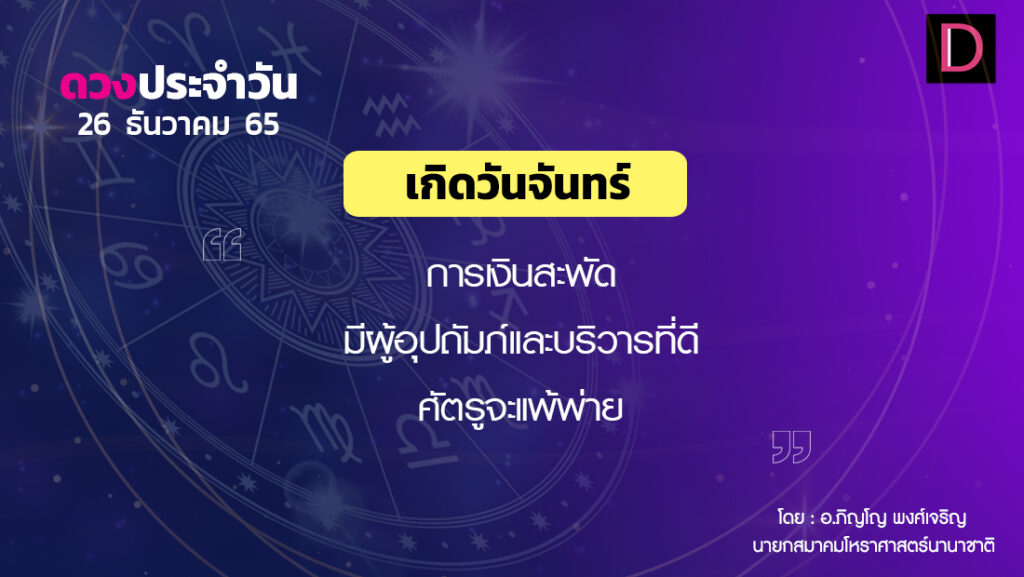 วันนี้ เวลา 00.00-21.54 น. ดาวจันทร์เสวยศรวณนักษัตรฤกษ์ที่ 22 ประกอบด้วยภูมิปาโลแห่งฤกษ์ ภูมิปาโล แปลว่า ผู้รักษาแผ่นดิน เวลา 21.55-24.00 น. ดาวจันทร์เสวยธนิษฐนักษัตรฤกษ์ที่ 23 ประกอบด้วยเทศาตรีแห่งฤกษ์หรือเวสิโยแห่งฤกษ์ เทศาตรี แปลว่า ข้ามถิ่น หมายถึงฤกษ์พ่อค้าข้ามถิ่น เวลา 00.00-24.00 น.-ห้ามทำการมงคล ทิศที่เป็นมงคล-ตะวันตกเฉียงใต้ ทิศอัปมงคล-ตะวันออกเฉียงเหนือ สีประจำวัน-ขาว สีสิริมงคล-ดำ ม่วงแก่ เทา สีอัปมงคล-แดง แดงส้ม ราศีที่ดาวศรีสถิต-มังกร ราศีที่ดาวกาลีสถิต-ธนู