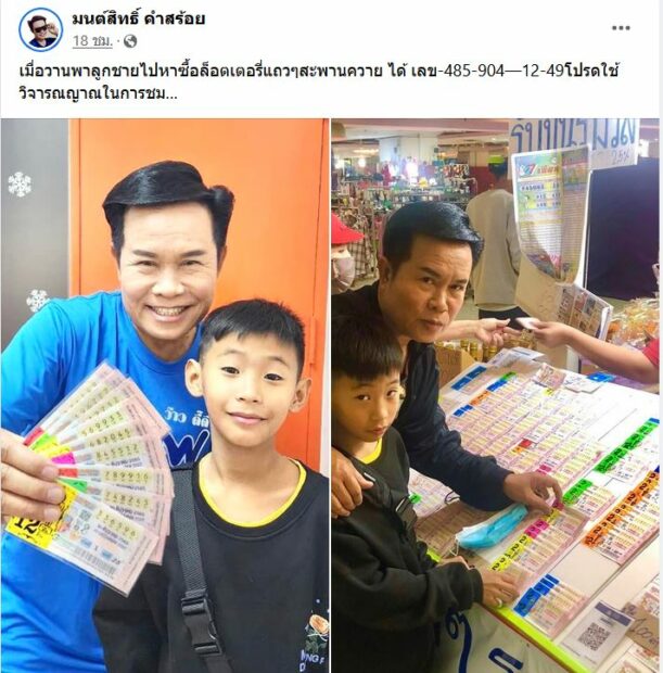 ขณะที่เจ้าพ่อใบ้หวยคนดัง “มนต์สิทธิ์ คำสร้อย” ก็ได้เผยเลขจากลอตเตอรี่ปึกใหญ่ที่ตัวเองซื้อ พร้อมทิ้งท้ายว่า บอกเลข 485-904-12-49