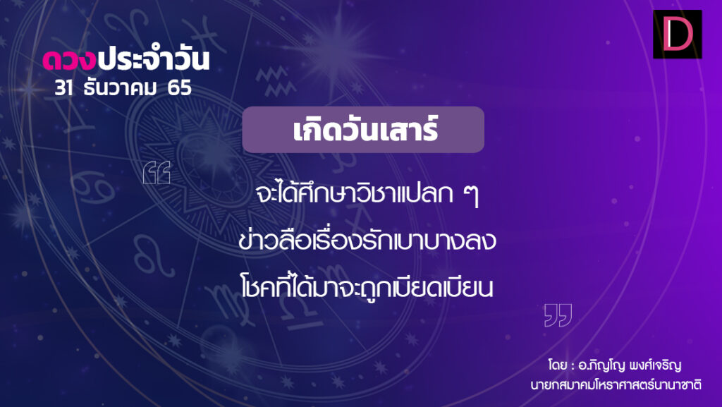วันนี้ เวลา 00.00-15.54 น. ดาวจันทร์เสวยเรวดีนักษัตรฤกษ์ที่ 27 ประกอบด้วยสมโณแห่งฤกษ์ สมโณ แปลว่า ผู้สงบ เวลา 15.55-24.00 น. ดาวจันทร์เสวยอัศวินีนักษัตรฤกษ์ที่ 1 ประกอบด้วยทลิทโทแห่งฤกษ์ ทลิทโท แปลว่า ผู้ขอ ผู้มักน้อย ยากจนเข็ญใจ เวลา 00.00-24.00 น.-ห้ามทำการมงคล ทิศที่เป็นมงคล-เหนือ ทิศอัปมงคล-ใต้ สีประจำวัน-ดำ สีสิริมงคล-ฟ้า น้ำเงิน สีอัปมงคล-เขียวสด ราศีที่ดาวศรีสถิต-ธนู ราศีที่ดาวกาลีสถิต-ธนู