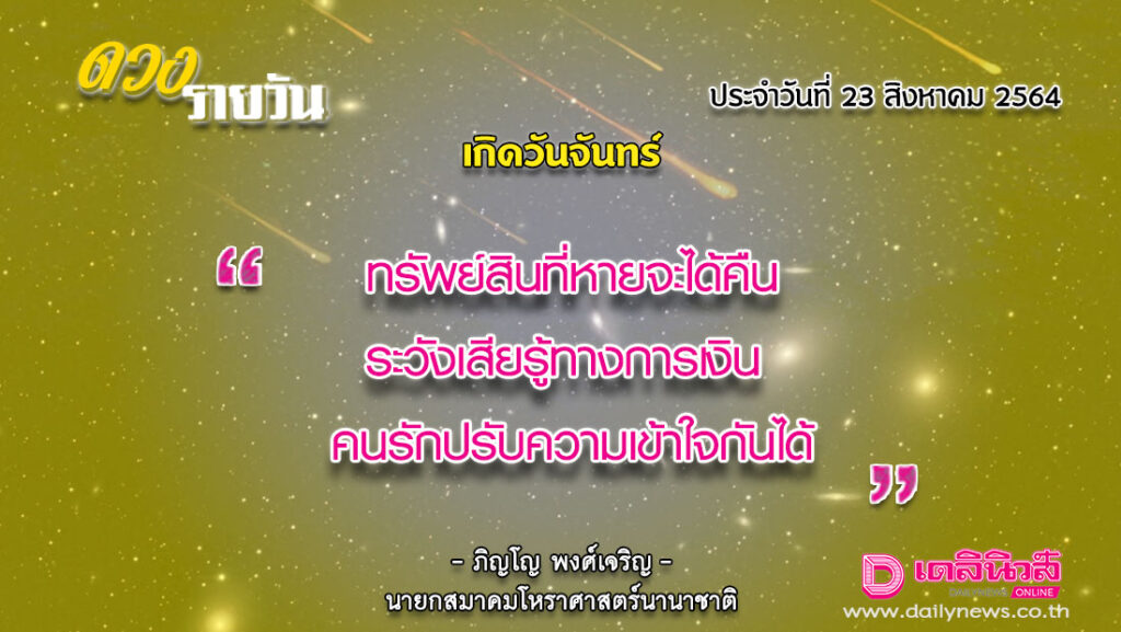 วันนี้ เวลา 00.00-19.54 น. ดาวจันทร์เสวยศตภิสัชนักษัตรฤกษ์ที่ 24 ประกอบด้วยเทวีแห่งฤกษ์ เทวี แปลว่า นางพญา หมายถึง สตรีผู้มีฐานะและตำแหน่งสูง เวลา 19.55-24.00 น. ดาวจันทร์เสวยปุรพภัทรบทนักษัตรฤกษ์ที่ 25 ประกอบด้วยเพชฌฆาตแห่งฤกษ์ เพชฌฆาต แปลว่า ผู้ฆ่า ทำการเพื่อให้สิ่งที่เข้ามาพ่ายแพ้ ข่มขวัญ น่ายำเกรง มีความขลังและมีความศักดิ์สิทธิ์ วันจันทร์-อธิบดีตามกาลโยค เวลา 00.00-24.00 น.-ห้ามทำการมงคล ทิศที่เป็นมงคล-ทิศหรดี(ตะวันตกเฉียงใต้) ทิศอัปมงคล-ทิศอีสาน(ตะวันออกเฉียงเหนือ) สีประจำวัน-สีขาว สีสิริมงคล-สีดำ ม่วงแก่ เทา สีอัปมงคล-สีแดง แดงส้ม ราศีที่ดาวศรีสถิต-มังกร ราศีที่ดาวกาลีสถิต-สิงห์