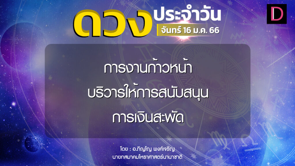 วันนี้ เวลา 00.00-13.30 น. ดาวจันทร์เสวยสวาตินักษัตรฤกษ์ที่ 15 ประกอบด้วยเทวีแห่งฤกษ์ เทวี แปลว่า นางพญา หมายถึง สตรีผู้มีฐานะและตำแหน่งสูง เวลา 13.31-24.00 น. ดาวจันทรเสวยวิสาขานักษัตรฤกษ์ที่ 16 ประกอบด้วยเพชฌฆาตแห่งฤกษ์ เพชฌฆาต แปลว่า ผู้ฆ่า ทำการเพื่อให้สิ่งที่เข้ามาพ่ายแพ้ ข่มขวัญ น่ายำเกรง มีความขลังและศักดิ์ สิทธิ์ เวลา 00.00-24.00 น.-ห้ามทำการมงคลทิศที่เป็นมงคล-ตะวันตกเฉียงใต้ ทิศอัปมงคล-ตะวันออกเฉียงเหนือ สีประจำวัน-ขาว สีสิริมงคล-ดำ ม่วงแก่ เทา สีอัปมงคล-แดง แดงส้ม ราศีที่ดาวศรีสถิต-มังกร ราศีที่ดาวกาลีสถิต-มังกร