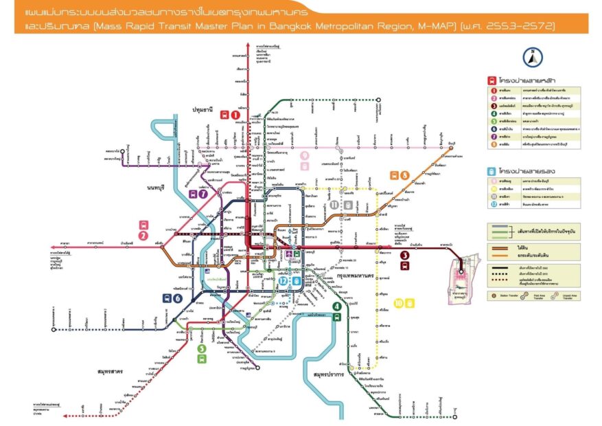 ตามแผนแม่บท ระบบขนส่งทางรางในเขตกรุงเทพมหานครและปริมณฑล (M-MAP) ระยะ 20 ปี (ปี 2553-2572)เปิดบริการแล้ว 11 สายทาง ระยะทางรวม 211.94 กิโลเมตร (กม.) อยู่ระหว่างก่อสร้าง 6 โครงการ 135.80 กม. กำลังประกวดราคา 1 โครงการ 13.40 กม. ดำเนินการร่วมลงทุนระหว่างรัฐและเอกชน (PPP) 6 โครงการ 71.49 กม. และเตรียมความพร้อม 9 โครงการ 120.78 กม.