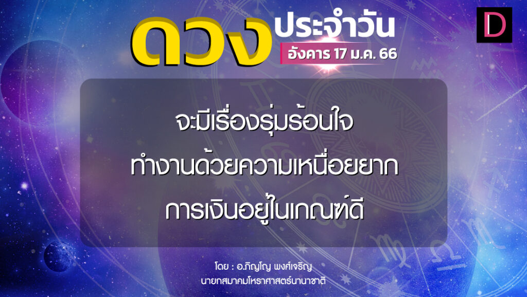 วันนี้ เวลา 00.00-13.06 น. ดาวจันทรเสวยวิสาขานักษัตรฤกษ์ที่ 16 ประกอบด้วยเพชฌฆาตแห่งฤกษ์ เพชฌฆาต แปลว่า ผู้ฆ่า ทำการเพื่อให้สิ่งที่เข้ามาพ่ายแพ้ เวลา 13.07-24.00 น. ดาวจันทร์เสวยอนุราชนักษัตรฤกษ์ที่ 17 ประกอบด้วยราชาแห่งฤกษ์ ราชา แปลว่า พระเจ้าแผ่นดิน วันอังคาร-อธิบดีและอุบาทว์ตามกาลโยค เวลา 00.00-11.00 น.-ห้ามทำการมงคล เวลา 11.01-13.06 น.-ทำการมงคลได้ตามฤกษ์บนหมวดเพชฌฆาตฤกษ์ เวลา 13.07-24.00 น.-ทำการมงคลได้สารพัดตามฤกษ์บนหมวดราชาฤกษ์ ทิศที่เป็นมงคล-ตะวันตก ทิศอัปมงคล-ตะวันออก สีประจำวัน-ชมพู สีสิริมงคล-เหลือง น้ำตาล สีอัปมงคล-ขาวงาช้าง ราศีที่ดาวศรีสถิต-มีน ราศีที่ดาวกาลีสถิต-พิจิก