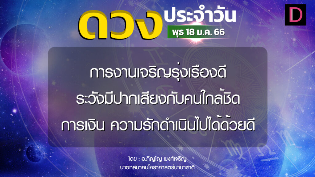 วันนี้ เวลา 00.00-12.18 น. ดาวจันทร์เสวยอนุราชนักษัตรฤกษ์ที่ 17 ประกอบด้วยราชาแห่งฤกษ์ ราชา แปลว่า พระเจ้าแผ่นดิน เวลา 12.19-24.00 น. ดาวจันทร์เสวยเชษฐนักษัตรฤกษ์ที่ 18 ประกอบด้วยสมโณแห่งฤกษ์ สมโณ แปลว่า ผู้สงบ วันพุธ-ธงไชยตามกาลโยค เวลา 00.00-09.52 น.-ทำการมงคลได้สารพัดตามฤกษ์บนหมวดราชาฤกษ์ เวลา 09.53-24.00 น.-ห้ามทำการมงคล ทิศที่เป็นมงคล-ตะวันตกเฉียงเหนือ ทิศอัปมงคล-ตะวันออกเฉียงใต้ สีประจำวัน-เขียว สีสิริมงคล-ม่วงดอกตะแบก สีอัปมงคล-ชมพู ราศีที่ดาวศรีสถิต-เมษ ราศีที่ดาวกาลีสถิต-พฤษภ