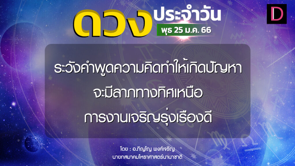 วันนี้ เวลา 00.00-01.54 น. ดาวจันทร์เสวยศตภิสัชนักษัตรฤกษ์ที่ 24 ประกอบด้วยเทวีแห่งฤกษ์ เทวี แปลว่า นางพญา หมายถึง สตรีผู้มีฐานะและตำแหน่งสูง เวลา 01.55-24.00 น. ดาวจันทร์เสวยปุรพภัทรบทนักษัตรฤกษ์ที่ 25 ประกอบด้วยเพชฌฆาตแห่งฤกษ์ เพชฌฆาต แปลว่า ผู้ฆ่า ทำการเพื่อให้สิ่งที่เข้ามาพ่ายแพ้ วันพุธ-ธงไชยตามกาลโยค เวลา 00.00-24.00 น.-ห้ามทำการมงคล ทิศที่เป็นมงคล-ตะวันตกเฉียงเหนือ ทิศอัปมงคล-ตะวันออกเฉียงใต้ สีประจำวัน-เขียว สีสิริมงคล-ม่วงดอกตะแบก สีอัปมงคล-ชมพู ราศีที่ดาวศรีสถิต-เมษ ราศีที่ดาวกาลีสถิต-พฤษภ