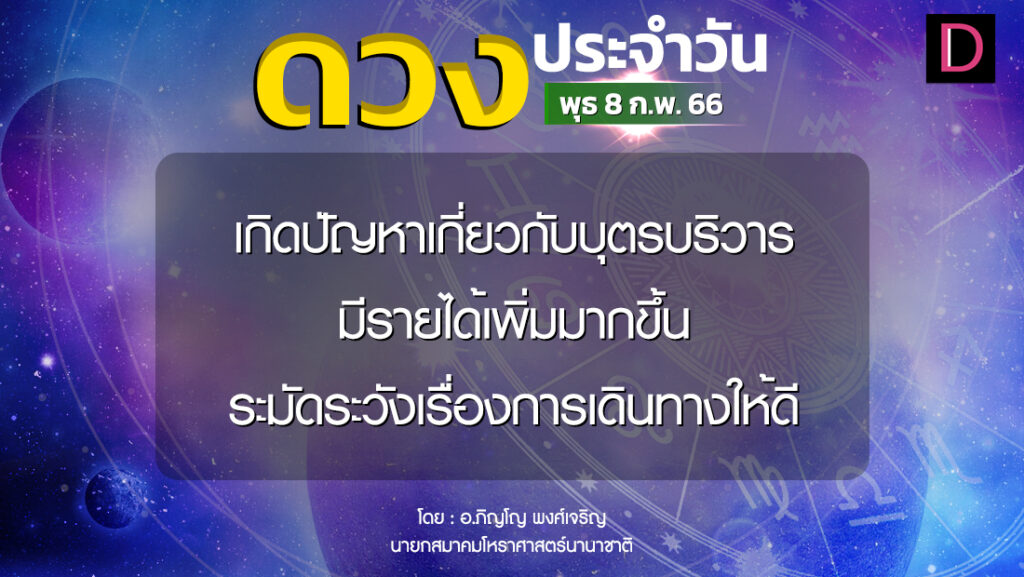 วันนี้ เวลา 00.00-17.06 น. ดาวจันทร์เสวยปุรพผลคุณีนักษัตรฤกษ์ที่ 11 ประกอบด้วย มหัทธโนแห่งฤกษ์ มหัทธโน แปลว่า คหบดี เศรษฐี ผู้มั่งคั่งด้วยทรัพย์สินเงินทอง เวลา 17.07-24.00 น. ดาวจันทร์เสวยอุตรผลคุณีนักษัตรฤกษ์ที่ 12 ประกอบด้วย โจโรแห่งฤกษ์ โจโร แปลว่า โจร ผู้ปล้น ผู้ลักขโมย วันพุธ-ธงชัยตามกาลโยค เวลา 00.00-06.44 น. -ทำการมงคลได้สารพัดตามฤกษ์บนหมวดมหัทธโนฤกษ์ เวลา 06.45-24.00 น. -ห้ามทำการมงคล ทิศที่เป็นมงคล-ตะวันตกเฉียงเหนือ ทิศอัปมงคล-ตะวันออกเฉียงใต้ สีประจำวัน-เขียว สีสิริมงคล-ม่วง ดอกตะแบก สีอัปมงคล-ชมพู ราศีที่ดาวศรีสถิต-เมษ ราศีที่ดาวกาลีสถิต-พฤษภ