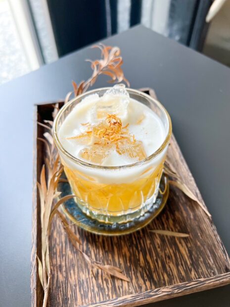 ปิดท้ายด้วยความสดชื่นกับ “ดื่มด่ำความสุข” ที่เห็นครั้งแรกก็ต้องขอบอกเลยว่า ใครจะไปเชื่อว่ากล้วยแขกตามสี่แยก จะถูกนำมาเสิร์ฟในรูปแบบของเครื่องดื้ม เป็นเครื่องดื่มที่ได้แรงบันดาลใจมาจาก “กล้วยแขก” ของกินชื่อดังย่านยางเลิ้ง แต่กลับนำมาดีไซน์และร้อยเรียงเรื่องราวผ่านส่วนผสมที่มีกลิ่นหอมเฉพาะ จนได้เครื่องดื่มที่มีเอกลักษณ์เฉพาะตัวในแบบฉบับของนางเลิ้ง และปิดท้ายเครื่องดื่มด้วยกล้วยตาก ขอบอกเลยว่าเข้ากันได้ดีอย่างคาดไม่ถึง