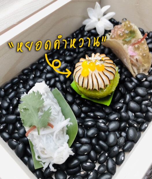 ต่อมาที่คำที่สองอย่าง “หยอดคำหวาน” หนึ่งคำหวานที่ถูกหยอดด้วยเรื่องราว ถูกเสิร์ฟเป็นคำ โดยเป็นขนมที่ได้แรงบันดาลใจมาจากขนมถ้วยใบเตยและครีมรสหวานของขนมเบื้องไทย ที่นำมาผสมผสานร่วมกันจึงได้เป็นขนมถ้วยใบเตยกับหน้า Coconut Sugar Meringue โรยด้วยไข่แมงดาสีเหลืองทอง ได้รสชาติกลมกล่อมทั้งคำมามิกซ์แอนด์แมตช์กันได้อย่างน่าสนใจ