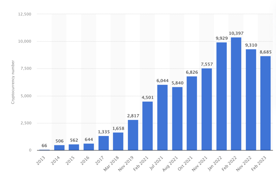 ข้อมูลจากเว็บไซต์ www.statista.com แพลตฟอร์มรวบรวมข้อมูลสถิติต่าง ๆ ทั่วโลก ณ วันที่ 17 กุมภาพันธ์ 2023 ระบุถึงจำนวนเหรียญคริปโทเคอร์เรนซีบนโลกนี้มีจำนวนมากถึง 8,000 กว่าสกุลในปัจจุบัน โดยจากกราฟจะเห็นจำนวนที่เพิ่มขึ้นเรื่อย ๆ โดยช่วงปี 2022 มีจำนวนมากที่สุดกว่า 10,000 เหรียญ แต่ถ้านับจำนวนเหรียญที่ได้มีการสร้างขึ้นและปิดตัวลงไปแล้วก็จะมีทั้งหมดประมาณ 21,844 เลยทีเดียว