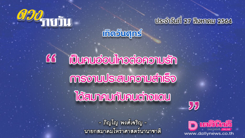 เกิดวันศุกร์ การที่เป็นคนอ่อนไหวต่อความรักจึงควรยับยั้งชั่งใจให้ดี เพราะมักจะมีเรื่องวุ่นวายในเรื่องรัก ๆ ใคร่ ๆ อยู่เสมอ จะได้รับมอบหมายให้วิ่งเต้นประสานงานสำคัญ มีเวลาน้อยที่จะให้กับคนรัก มีการริเริ่มโครงการใหม่ ๆ จะได้สมาคมกับคนต่างถิ่นต่างแดน ควรดูแลสุขภาพของตนเองและคนรักให้ดี