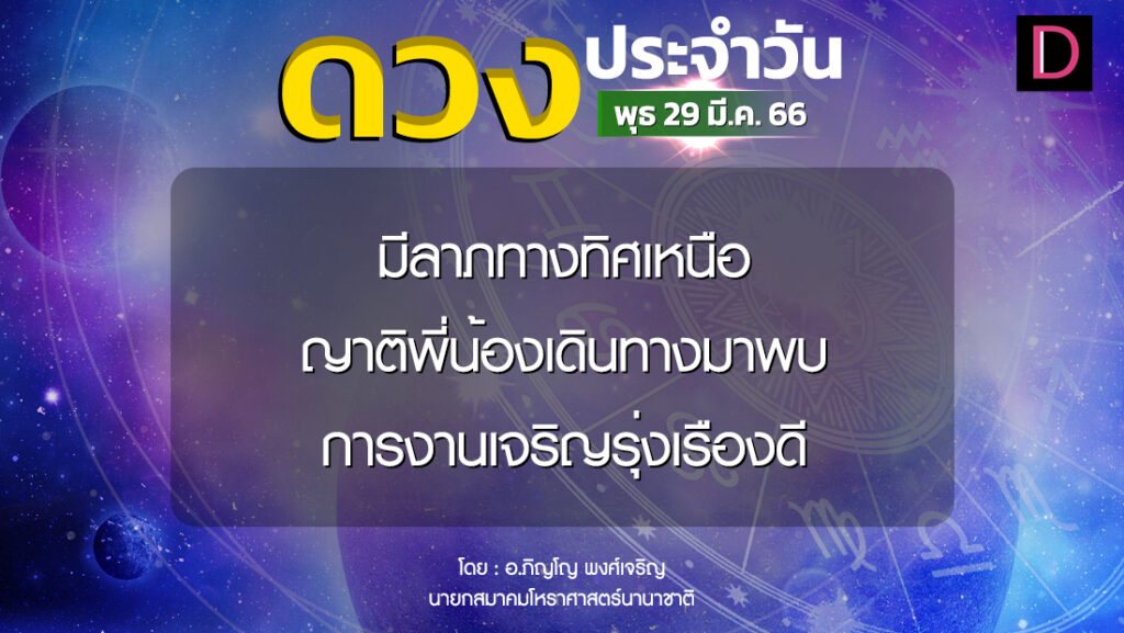วันนี้ เวลา 00.00-19.54 น. ดาวจันทร์เสวยอารทรานักษัตรฤกษ์ที่ 6 ประกอบด้วยเทวีแห่งฤกษ์ เทวี แปลว่า นางพญา เวลา 19.55-24.00 น. ดาวจันทร์เสวยปุนนัพสุนักษัตรฤกษ์ที่ 7 ประกอบด้วยเพชฌฆาตแห่งฤกษ์ เพชฌฆาต แปลว่า ผู้ฆ่า ทำการเพื่อให้สิ่งที่เข้ามาพ่ายแพ้ วันพุธ-ธงไชยตามกาลโยค เวลา 00.00-24.00 น.-ห้ามทำการมงคล ทิศที่เป็นมงคล-ตะวันตกเฉียงเหนือ ทิศอัปมงคล-ตะวันออกเฉียงใต้ สีประจำวัน-เขียว สีสิริมงคล-ม่วงดอกตะแบก สีอัปมงคล-ชมพู ราศีที่ดาวศรีสถิต-เมษ ราศีที่ดาวกาลีสถิต-มิถุน